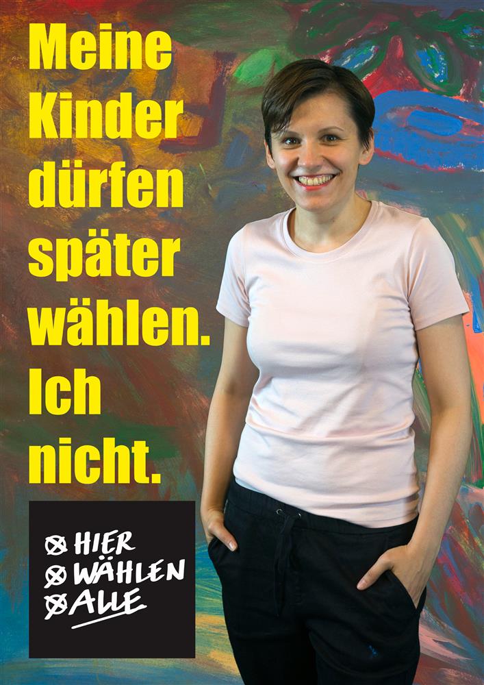 Plakat seeriast „Siin valivad kõik“, mille Uus Naabruskond tegi 2017. aasta parlamendivalimiste eel. Plakatil kujutatud Marina Napruškina ütleb: „Minu lapsed tohivad valida, kui on täiskasvanuks saanud. Mina mitte.“