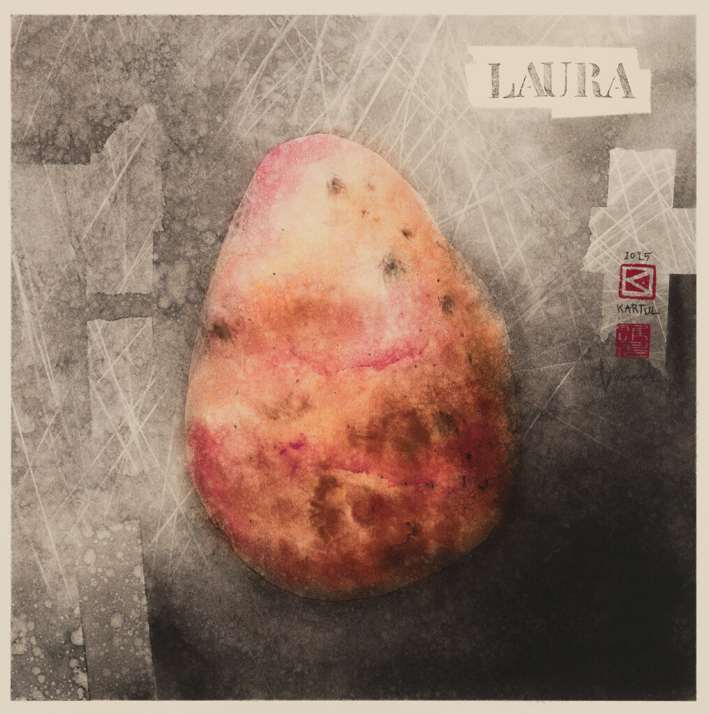 Ott Kadariku näituse pealkiri viitab uuele testamendile, täpsemalt mõttele Pauluse esimesest kirjast korintlastele: „Ent nüüd jääb usk, lootus, armastus, need kolm, aga suurim neist on armastus“ (1Kr 13:13). See väljendab õpetust, mille kohaselt on armastus tähtsaim isegi usust. Armastuse asendamine kartuliga näituse pealkirjas on tore sõnamäng ning pakub tõlgendusruumi. Samanimeline teos „Kartul“ kõneleb autori lapsepõlvest Lasnamäel ning nn lasnaka identiteediga kaasnevast ühtaegu poolikust tundest. Kusjuures näitusel ei jää mainimata ka 1970. aastatest kavandatud kurikuulus Laagna tee ehk Laagna trammikanal. Lapsepõlve teema jätkub näitusel teosega „Meteoriit?“, millega luuakse seos kartuliga – nimelt oli see arhitekti noorpõlves, Nõukogude Liidu lagunemise järel, vaestel 1990. aastatel põhitoidus, mida maalt sugulaste käest saadi ja eri roogadeks keedeti, praeti, hautati jne. Eelmainitud teosed ja joonistus „Porgand“ on ainsad, mis on näiliselt seotud Eestiga, kõikide teiste tööde mõtteruum on ühine pigem Jaapani omaga. Kuid eks ole kartul ju üks eestluse alustalasid. Kas näituse pealkirjas vihjatakse kodumaale, lapsepõlvele või mõlemale korraga – see jääb igaühe enda otsustada. Näitus ei anna ega proovigi anda selgeid vastuseid, vaid igaüks saab ise omad järeldused teha, ka on seda keeruline žanriliselt liigitada. Ja see ongi põnev!