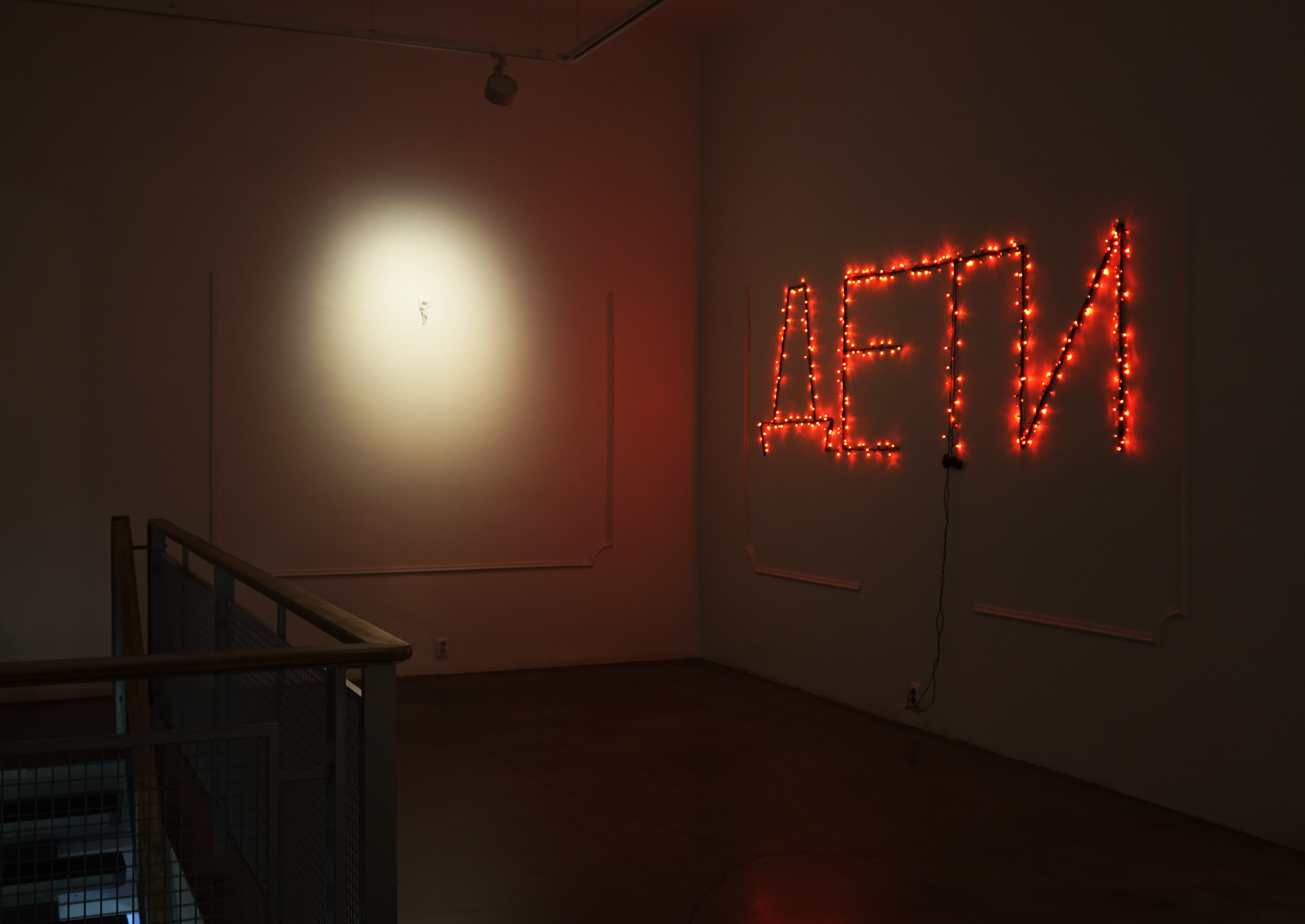 Mis on aga väljas tutvustataval näitusel? Kuna avamine on kell kuus õhtul, kui novembris on täiesti pime, tervitab näitusele saabujat juba enne galeriisse sisenemist üsna pimedast näitusesaalist tänavalegi paistev punastest leedlampidest kirillitsas kiri „Deti“ (eesti keeles „lapsed“). See neljatäheline sõna jõudis uudiste vahendusel kogu maailma teadvusse, kui Vene väed pommitasid puruks Mariupoli teatrimaja, kuhu olid varjunud paljud linnakodanikud. Kiri maja kõrval asfaldil oli mõeldud õhust tulevat rünnakut ära hoidma, see oli hävituslennuki piloodile taevast näha. Loomulikult mõjub fakt, et teadaandmine, kantud humanismi vaimust ning lähtudes eeldusest, et kohta, kus varjuvad (ka) lapsed, ei pommitata, ei hoidnud mitte kui midagi ära, erakordselt rusuvalt. Intsident tõi endaga kaasa kuni 600 hukkunut ja Ukraina president Volodõmõr Zelenskõi on seda nimetanud sõjakuriteoks.