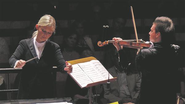 Põhjamaade Sümfooniaorkester avas oma hooaja lisaks Tartule ja Tallinnale ka Stockholmis Berwaldhallenis. Pildil dirigent Anu Tali ja solist Sergei Dogadin.