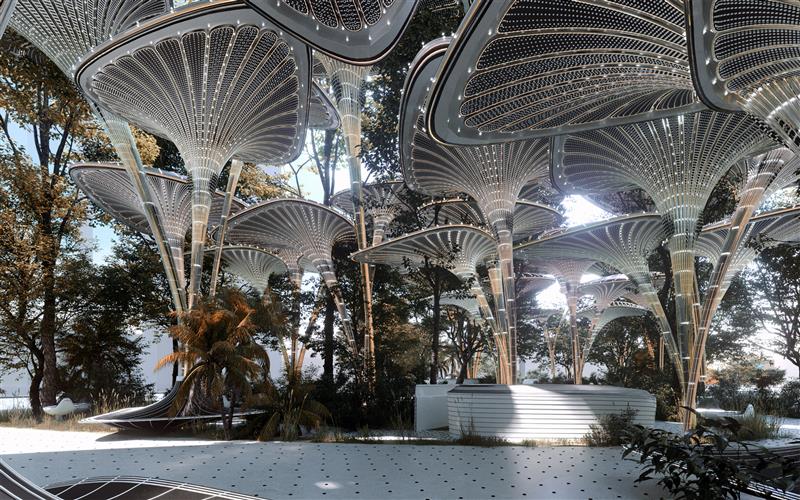 Kirjeldatud visiooni illustreerib hästi Dubai projekt „The Oasys”: palmidest inspireeritud vormidega linnaoaas, kus nn palmilehtede all on kraanid, mis pihustavad uduvihma, lehtede peal asuvad päikesepaneelid.