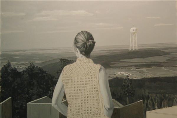Maalidest on intrigeerivaim „Kaks torni“, millega antakse vaatajale võimalus vaadelda maastikku ja sellest kõrguvat (pakun, et) veetorni üle suvekleiti kandva noore naisterahva õla. Noorema põlvkonna ühe ägedama kunstiteadlase Liisa Kaljula koostatud näituse bukletis küsitakse põhjuse üle, mis sunnib suvitajaid tornides turnima ja silmapiiri laiendama, ning nähakse igasugu ekskurseerimises eskapismi üht vormi, iseenese juurest pagemise võimalust. „Kahe torni“ vaatamisel tekitatakse vaatajas nii füüsiline kui ka emotsionaalne dissonants, sest maalil avalduv vaatepilt saab vaatajale avaneda vaid sellesama tornist paari meetri kaugusel seisva nooriku asukohalt. Kõrgust kartva näitusekülastaja puhul võib vaatajapositsiooni teadvustamine päädida pisikese paanikahäirega. Mul igatahes midagi sellist juhtus. Võib-olla soodustas seda tollel laupäeval põetud õrn pohmell, mis ehk seletab ka argisest intensiivsema iha astuda sammuke lähemale naise kutsuvalt suvisele seljale, riivata ta saledaid käsivarsi, tunda kleidiriide tuhmi plaksumist tuules. See naine vaataja ees ei ole tavaline turist. Ta on selleks liiga hästi riides ja ilmselt tulnud kohtingule, mitte ainult aega veetma või avardama silmapiiri, mida ta vaatajaga mingil moel (mis moel, saab vaataja ise mõtestada) jagab.