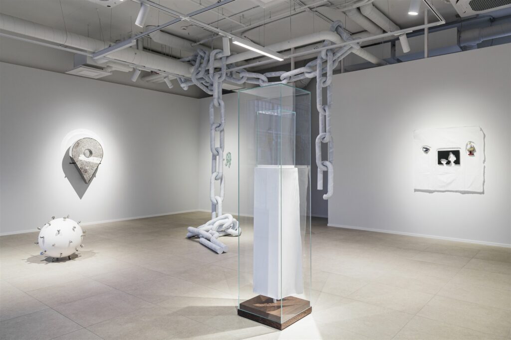 Siiski on kujur endast maha jätnud ka paar objekti, millel leidub ilmsemaid artefakti tunnuseid. Näiteks kõrgub siin kena valge postament, mis ise on suletud kaitsvasse klaasvitriini, ning mille peal asetseb teine, väiksem klaastahukast vitriin, mis jumal paraku – ei sisalda midagi. Aga inimene vähemalt üritas. Tänamatum ja kriitilisem pilk märkab kindlasti ka seda, et turvaklaasi taha varjunud valge postamendikuupki on ühest servast pikalt lahti kärisenud nagu liiga moekas lõhikuga kleit, haava servadki narmendamas nagu rebitud kangas. Ning haigutavast praost paistab midagi, mis vajab vanemlikku selgitust. Ikka selleks, et mitte lasta võimust võtta tundel, et kogemata kombel on tõepoolest eksitud galerii köögipoolele, kus vegeteerivad ambivalentses hämarolekus esemed, mis pole veel näituseks saanud või on selle piduliku hetke oma elukaarel juba seljataha jätnud ning triivivad kaduviku teel.