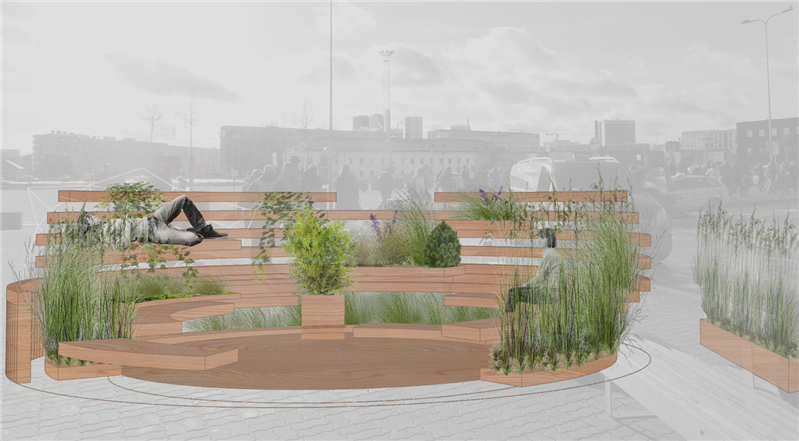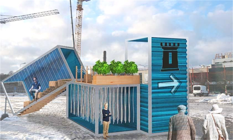 Sadamapiirkonna lagedavõitu, ehitustandritega hakitud ruumi organiseerimiseks ja inimeste suunamiseks pakkusid arhitektuuritudengid välja mitu huvitavat linnainstallatsiooni. Need ideekavandid tõendavad, et tee blokeerimiseks ei ole vaja kasutada torupiirdeid ning suunamiseks väikesi rohelisi silte, vaid saab ka palju loovamalt.
