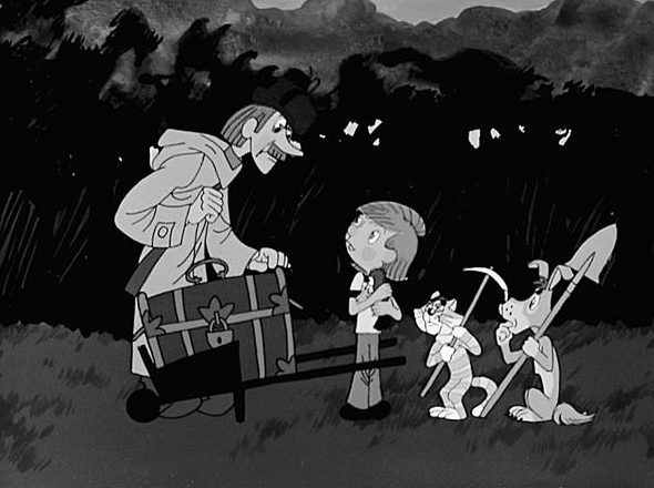 Prostokvašino multifilmid tungisid omal ajal, 1970. ja 1980. aastatel, peensatiiriliste nooltena totalitaarse süsteemi korruptiivsusse. Praeguses mõistes hajaasustuse piirkonda kolinud onu Fjodor läheb koos Matroškini ja Šarikuga öösel aaret otsima. See, et eraomandi ihaldamine head ei tõota, on juba ette teada asi. „Juhuslikult“ jookseb aarde leidnud öistele seiklejatele vastu postiljon Petškin, kes küsib: „Mida te selles kirstus tassite?“ Enesekindlalt ja resoluutselt vastab kass Matroškin: „Me käisime sellega seenel, on selge?“ Selle asemel et asja vastu huvi tunda või kuhugi edasi kaevata, ilmutab Petškin aga hoopis afääri kaasosalise tundemärke. „Selge muidugi, mis seal segast saab olla,“ laiutab ta käsi ja aardeküttide seltskond marsib kiirel sammul otsejoones koju.