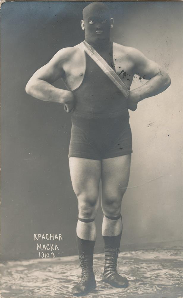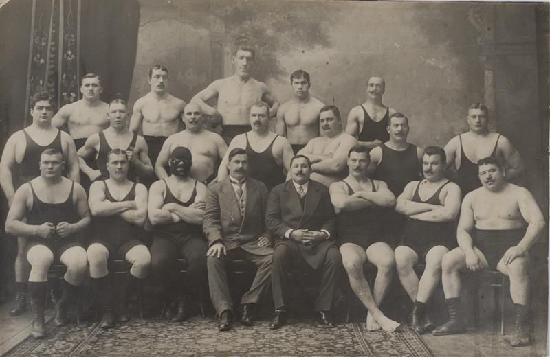 Elukutseliste maadlusturniirist osavõtjad I maailmasõja eel Chiçinăus. Tagareas vasakult 1. ja 2. on eestlased Karl Tomberg ja Reinhold Heuer ja – nagu näha – poseerib teiste seas uhkelt ka üks maskiga maadleja.