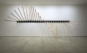 Keegi ei saa aga minu arvates ligilähedalegi Poola kunstniku Ewa Axelradi projektile „Štama“, mis koosneb videost, saarepuidust lipuvarrastest terasest lipuvardahoidjates, vaigufragmentidest ja puitraamis fotost. Sain seda tööd vaadates aru, miks just neid meediume oli vaja kasutada. Ja neil objektidel on peale poliitilise laetuse ka selge esteetiline, võõritav, poliitikaalune toime.