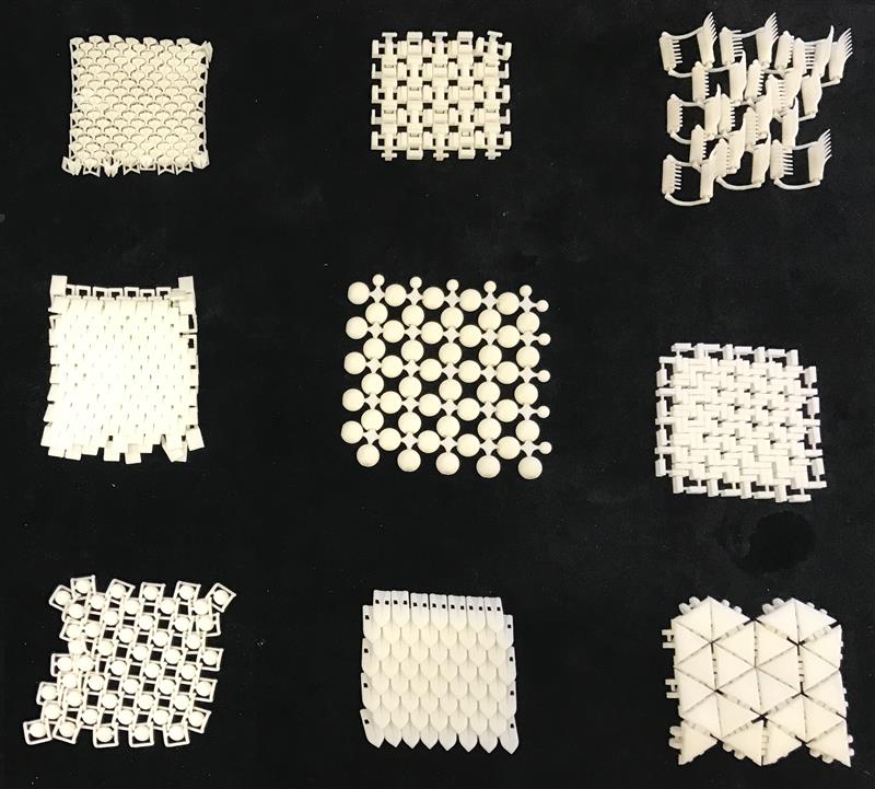 Lõimegeomeetria 3D-prinditud näidispinnad on jäigast plastmaterjalist hoolimata paindlikud ja nende geomeetriasse on kodeeritud materjali omadused. EKA sisearhitektuuri II kursuse tudengite tööd 2016. aastal.