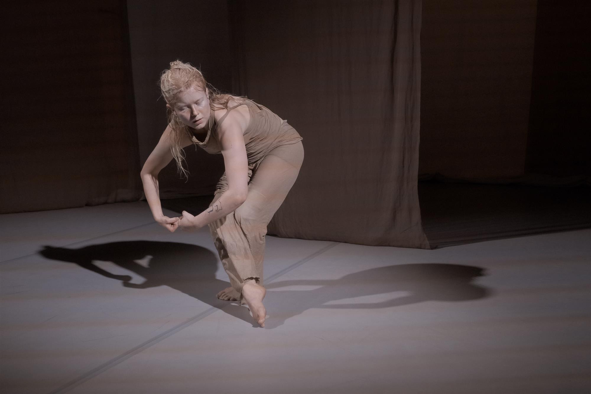 Maria Solei Järveti „Strata“. Lavakujundus on minimalistlik: hele tantsupõrand ning mõned ruumi raamistavad õhukesest kangast lendlevad riidepaanid. Esimese publikurea varvaste lähedal asetseb klaasist kuubik, milles hõljub defineerimatu ollus. Etendaja astub pingestatud olekus lavale, justkui oleks ta maasse juurdunud. Kui publik saabub saali, kostab kõlaritest intervjuude kaudu kogutud helimaterjali: erisugused hääled selgitavad suhet oma kehasse, kirjeldavad keha muutumise kogemust, räägivad menopausist, vigastustest, oma vajaduste märkamisest ning kehakuvandist – kõik see häälestab vaataja ootama kehapositiivset, kehapõhist ja sooja lavastust. Reaalsus on aga teistsugune. Lavastus on üles ehitatud keelelisele materjalile: metafooridele, mille kaudu on tavaks kirjeldada keha.
