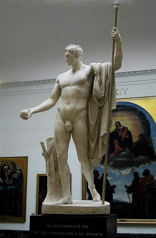Alustagem ühe varasema näitega ajast, mil skulptuuriturul domineerisid veel klassikalised patronaažisuhted. Nimelt oli Prantsusmaa esimene konsul ja pärastine keiser juba võimule kerkides Antonio Canova, tolle ajastu esiskulptori loomingu austaja. Ta kutsus kunstnikku korduvalt Prantsusmaale. Nende esimene kohtumine, mille jooksul Canova modelleeris Napoleoni portreebüsti, mis oli algselt mõeldud ratsamonumendi visandiks, leidis aset 1802. aastal. Ratsafiguurist loobuti ja Napoleon esitas propaganda eesmärgil Canovale tellimuse teha rahu toova sõjajumala Marsi figuur. Tellija andis autorile vabad käed, millele kunstnik vastas üsna radikaalses vormis. Nimelt valmis tal 1806. aastaks 3,45 meetrit kõrge marmorskulptuur, mis kujutas ihualasti Napoleoni. Isevalitsejal oli selle suhtes juba algusest peale kahtlusi, millele osutab see, et Canova Rooma stuudiost transporditi kuju Prantsusmaale alles 2011. aastal. Napoleon vaatas kuju üle enne selle juba välja kuulutatud eksponeerimist Louvre’is ja kohkus: ilmselt oli portreekujutis alasti Rooma sõjajumalana liig isegi tema edevuse juures. Pärast Napoleoni lüüasaamist ostis kuju Louis XVIII-lt Briti valitsus ja kinkis selle Wellingtoni krahvile. Praegu on skulptuur eksponeeritud Apsley House’i trepikojas Londonis.