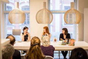 Festivalil „Prima vista“ esinenud luuletajad Sanna Karlström (paremal) ja Henriikka Tavi (vasakul). Vestlust juhtis Heidi Iivari (keskel).