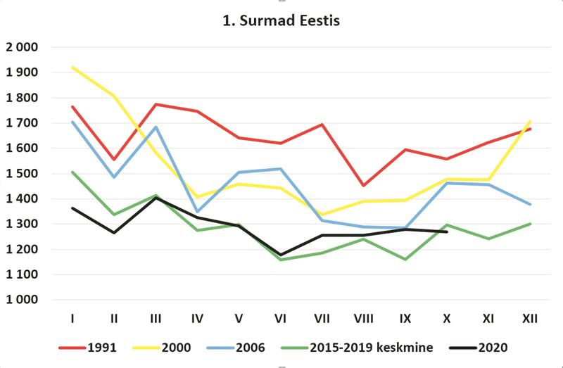 Väärib märkimist, et aastane surmajuhtude üldarv püsib Eestis stabiilsena ja tänavune suremus jookseb kenasti viimase viie aasta keskmise kursil (joonis 1). Ka üle kontinendi suremuse jälgimisega tegelev keskus Euromomo* kinnitab, et Eestis ei ole tänavu liigsuremust (arvestuslikult ootuspärasest rohkem surmajuhtumeid) esinenud. Tähendab, mitte isikuti, aga statistiliselt sureksid need, kes surema peavad, ennustatud arvul niikuinii, olgu maal koroona või mitte. Sama kehtib kõigi Põhjamaade kohta, mis võib eriti Rootsi puhul mõnesid üllatada, aga mis seletab hästi rootslaste seni üsna rahulikku suhtumist suremusnäitajasse. Lõuna- ja Lääne-Euroopa pilt on hoopis kurvem, mis võiks edaspidi anda mõtlemisainet neile, kes tahavad kaardil ohtlike ja ohutute tsoonide vahele piire tõmmata.