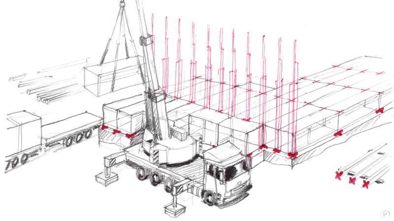 Iga üksiku mustermaja mooduli kandekonstruktsioon on nii tugev, et seda saab turvaliselt tõsta ja transportida – tugevus saavutatakse moodulite omavahelise ühendamisega. Hoone skeleti moodustavad kandeelemendid, nt nurgapostid, vahelaed ja jäikusseinad, ning kandvad vertikaalsed elemendid. Moodulite põrandate ja lagede omavaheline ühendamine ja lisatud vertikaalsed elemendid seovad moodulite kandvad osad ühte ja nii saab üksteise peale asetada seitse kuni kaheksa moodulikihti.