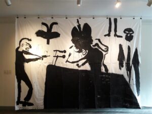 Tsaari tapmine. Näituse keskseima tööna tõstan esile Alissa Joffe maalingu, mis peaks kujutama tsaari tapmist. Kunstniku enda sõnul on see ühiskonnale mõeldamatu süžee. Seda maali tõukasid teda tegema Venemaa praegused sündmused, mille kohta kunstnik ütleb umbes nii: pühakuks kuulutatud tsaari Nikolai II ja Stalini ülistamine on ühiskonnale transleeritav jõud, mis ei allu kriitikale. Teos seisneb selles, et valgele riidele on musta värviga mäkerdatud kujundid, mis kujutavad kõnet pidavat monstrumit tulistavat kantpead. Kokkuvõttes näeb teos aga välja nagu mingi maagilise rituaali jäänuk: seal on mõningaid maagilisena mõjuvaid kujundeid ja üldse on sellesse teosesse kontsentreeritud must energia.