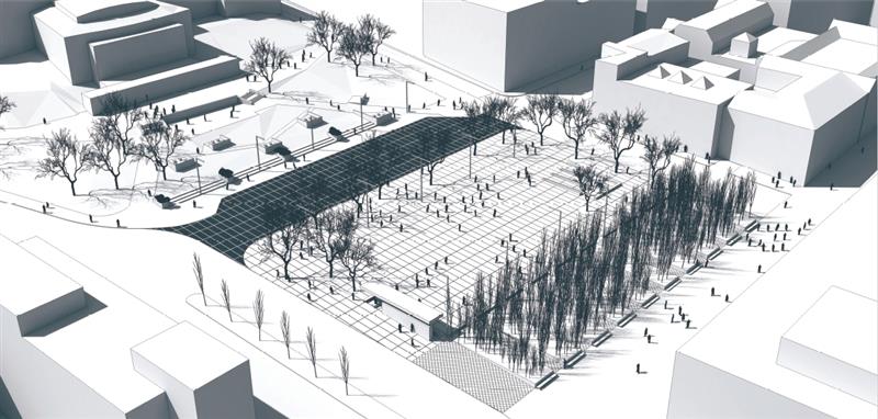 Võistlustöö „Palett ja ballett“ eristub maastikulisusega. Lahenduses käsitletakse praeguse pargi elemente äärmiselt tundlikult, kõrghaljastus on suures osas alles jäetud. Töö peamine idee on tõstetud pinnaga haljaste oaaside kogum, mis joonistub platsile liikumissuundi järgivate radade abil. Selline liigendus loob mugavate ja sümpaatses mõõdus õueruumide jada, kus on parajalt väikesi pisiparke ja ka piisavalt sillutatud pinda. Võistlustöös võimendatakse platsi praegusi häid külgi. Läbi pargi liikumine on selge, Küüni tänava suunalt saab ettevõtmised läbipääsude kaudu pargialale hajutada.
