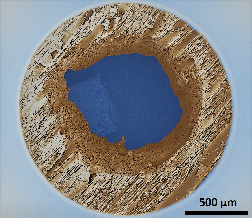 Peenstruktuuride uurimine. Skaneeriva elektronmikroskoobiga tehtud sekundaarsete elektronide pilt kase spooni pinnast, millesse on laseriga tulistatud auk.