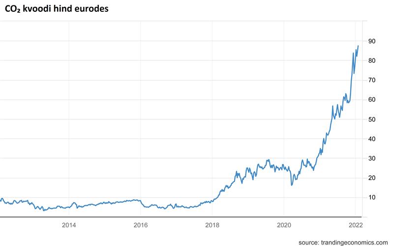 Meenutagem, et see langus toimus esimese kahe-kolme aasta jooksul pärast Nõukogude Liidu lagunemist, kui Eesti majanduses ja tööstuses leidsid aset suured muutused ning põlevkivitööstus ulatuslikult kokku tõmbus. Muide, põlevkivi kaevandamismahud olid tipus 1980. aasta paiku, kuid Venemaal käivitati mitu tuumajaama ja vajadus põlevkivi järele vähenes. Vähenesid ka piirkonna süsiniku ja muud keskkonna jalajäljed. Kuni 2018. aastani toodeti Eestis põlevkivienergiat piisavalt, ja veidi enamgi, et katta kodumaine tarbimine ja müüa naabritele. 2018. aastal hakkas ettenähtud mõju avaldama juba sajandi alguses ellu kutsutud Euroopa Liidu CO2 heitkogustega kauplemise süsteem – CO2 heitkoguse ühiku hind tõusis aastaga enam kui kolm korda ja senise 7 euro asemel tuli õhku paisatud CO2 tonni eest hakata maksma 24 eurot, vt joonis 3.4 Pandeemia ajal energiatarbimine ajutiselt küll pidurdus ja CO2 hind püsis stabiilsena 25–30 euro juures, kuid nüüdseks on nii energiatarbimine, CO2 heitmed kui ka CO2 hind saavutanud taas uued tippmargid. CO2 hind läheneb hoogsalt 100 eurole.