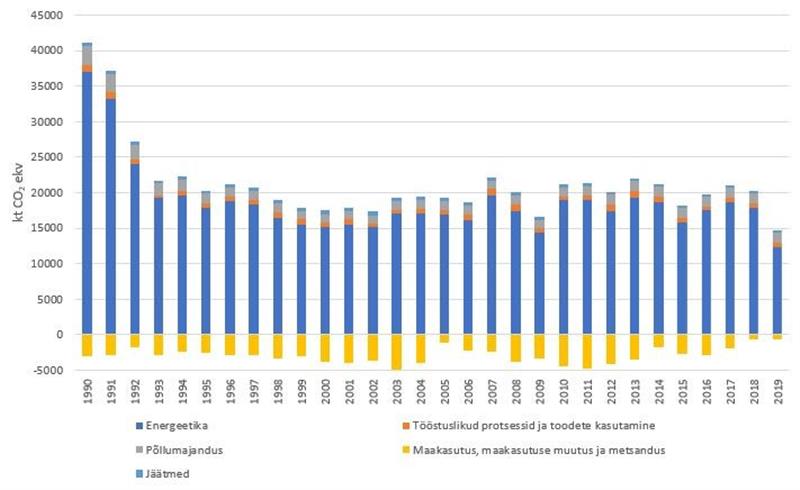 Kuidas oleme jõudnud olukorda, kus oleme? Eesti kasvuhoonegaaside heitkogused on võrreldes 1990. aastaga vähenenud rohkem kui poole võrra (joonis 2).