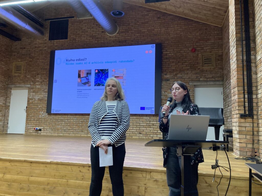 Arhiivide tööd tehisaruga hoiavad tagasi delikaatsed isikuandmed. Et tehisaru arendada ja rakendada, on vaja rohkem ressursse – nii raha, aega kui inimesi. Praegust aega kasutataksegi rahvusarhiivis eeltööks, luues kvaliteetseid andmeid ja digikogusid, mida edaspidi tehisarule ette anda. Rahvusarhiivi arhiivipedagoogid Edith Eskor ja Liisi Pabstel tutvustasid, millised on arhiivis kasutatavad tehisaru tööriistad. Tekstituvastusplatvormiga Transkribus on hulk käsikirjaliste tekstide sisu tuvastatud ja tekst on nüüd otsitav. See lihtsustab märkimisväärselt uurija tööd käsikirjadega. Loodud on rakendus Ilme, mis tuvastab fotode võrdlemise kaudu nägusid ja otsib sarnaseid fotosid rahvusarhiivi fotode andmebaasist.