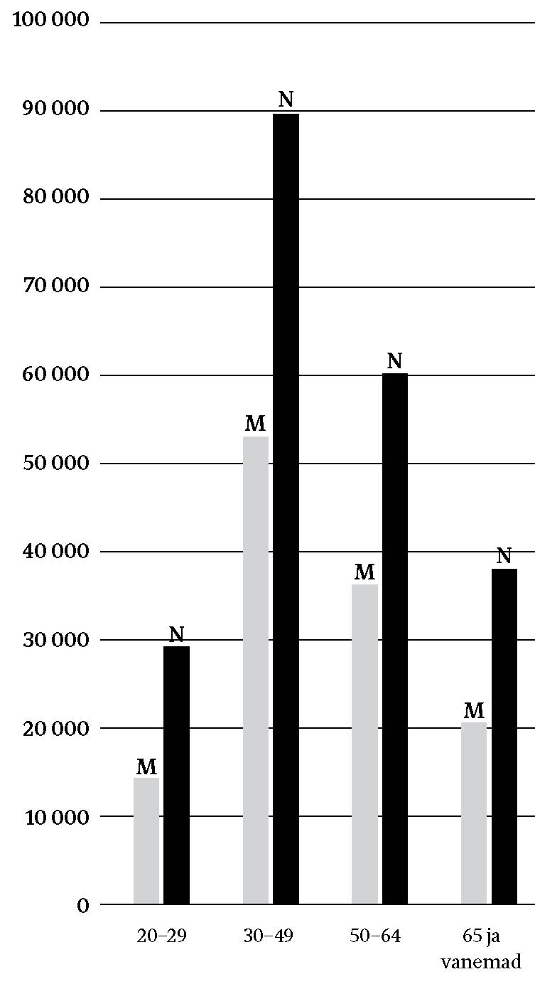 Eestis on sõdade ja okupatsioonide kaasmõjul naiste domineerimine ülikoolis hoopis varasem nähe kui mitmel pool Lääne-Euroopas. 2011. aasta rahvaloenduse andmed näitavad, et kõrgharidusega naisi on meestest rohkem kõigis vanuserühmades (joonis 3).