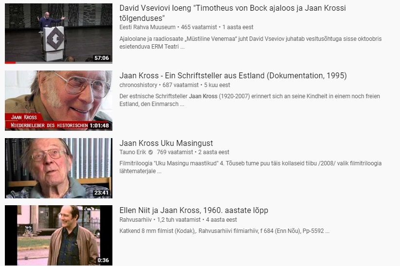 On kakskümmend minutit Krossi ja Masingu läbikäimise kohta,1 David Vseviovi loeng „Timotheus von Bock ajaloos ja Jaan Krossi tõlgenduses“2 ning üks mõnusalt sisukas saksakeelne dokfilm 1995. aastast: „Ein Schriftsteller aus Estland“ („Kirjanik Eestimaalt“).3 Peale selle filme, omajagu „Wikmani poisse“ ja „Kolme katku vahel“ ning ja Enn Nõu filmitud 30 sekundit 1960. aastate lõpust.4 Võrreldes näiteks Thomas Manni või ka Tõnu Õnnepaluga seda materjali peaaegu ei olegi, ja kindlasti ei piisa sellest noorele inimesele, kellele Youtube on üks esimesi info otsimise kohti.