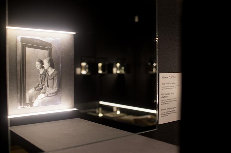 „Hõbetüdrukute“ näitusel on iseenesest efektne näitusekujundus, kus väikseid vanade fotode digikoopiaid suurendavad peeglid. Marta Pļaviņa. Peegli ees istuv tüdruk. 1920ndad–1930ndad. Väljatrükk. Aizkraukle ajaloo- ja kunstimuuseumi kogu.