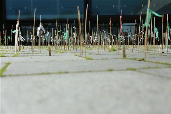 Katrin Saarits on lahendanud oma isikliku väikese territooriumi, lähtudes muuseumi poolt kunstnikele esitatud turvanõuetest. Kuna õue sillutise kiviplaatidesse ei tohi teoste kinnitamiseks auke puurida, kasutas ta nutikalt plaate ümbritsevaid „vuuke“, torgates pehmesse pinda tuules lehvivate lindikestega lakitud pirrud. Nii kujundatud väike saareke tekitab mitmeid assotsiatsioone. Meenuvad filmid Metsiku Lääne koloniseerimisest, kus asunikud ühise metsiku galopi tulemusena torkasid maasse oma maatüki piiri tähistava teiba, mõte võib aga minna uitama ka tuules plagisevate palvelipukestega religioossetesse paikadesse.