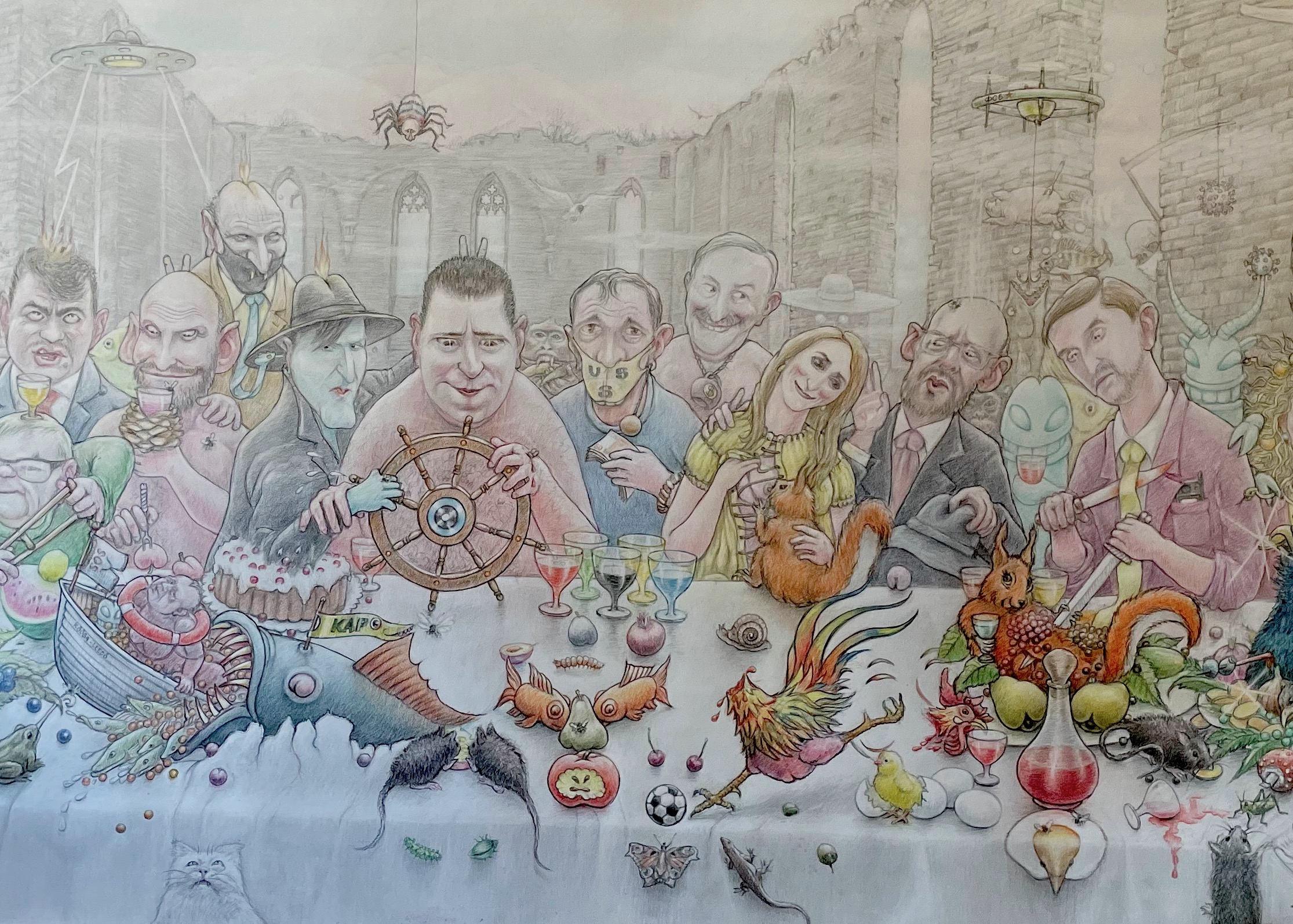 “Püha õhtusöömaaja” tegevuspaigaks on Pirita klooster ning keskseks tegelaseks teose valmimise ajal valitsust juhtinud Jüri Ratas. Tema paremal käel asuvad Helmed – isa loeb pojale ussisõnu – ning vasakul patiseisu rõhutamiseks isa-tütar Kallased. Lisaks on teosele jõudnud Eesti Olümpiakomitee esimees, rahapakkide ja pendliga Urmas Sõõrumaa ning kujutatud on mitmeid sümboleid alates Herman Simmi riigireetmisest Aleksei Navalnõi mürgitamiseni. Mängukaartidena vormistatud joonistused keskenduvad aga maailma poliitilisele eliidile läbi viimase aastasaja. Oma koha kaardipakis on leinud nii Donald Trump, Mao Zedong, kaksikmotiiv Hitlerist ja Putinist ning mitmed maailma liidrid. Näitust täiendavad puuskulptuurid, mis justkui vastanduvad kaasaegse kunsti arusaamale “kunst kunsti pärast” ning on nimme praktilise väärtusega, ehk vormistatud tooli, laua või tool/laua/panipaigana.