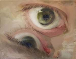 Maarja Nõmmiku tööd on jäänud endiselt realistlikuks, üllatab aga väike formaat. Varasemast tuttav silmamotiiv kuulub seeriasse „Juhtumisi“ (2016–2017).