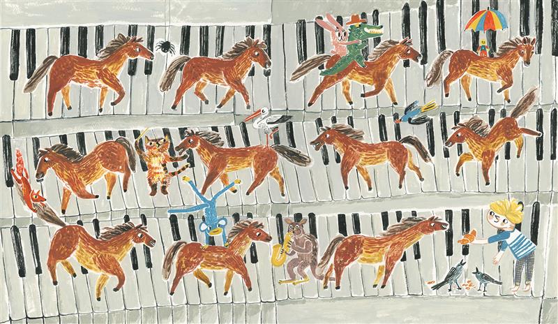 Anna Vaivare (1987) guaši- ja akvarelltehnikas loodud isikupärased illustratsioonid annavad imeliselt edasi teose hoogu ja mängulisust. Ka näitab kunstnik end tõelise koloriidimeistrina. Erinevad värvitoonid, mille seast tõusevad esile punakaspruunid, sobituvad kokku kenaks tervikuks ja toovad hästi esile pildi idee. Tegelaste emotsioonide ja detailide kujutamine pakub ühtlasi nii nalja kui ka avastamisrõõmu. Lugeja südame röövib näiteks poisi kass, keda on kujutatud nii hobusele klaveril taktikepiga takti löömas kui ka klaveri peal saiakest nosimas.