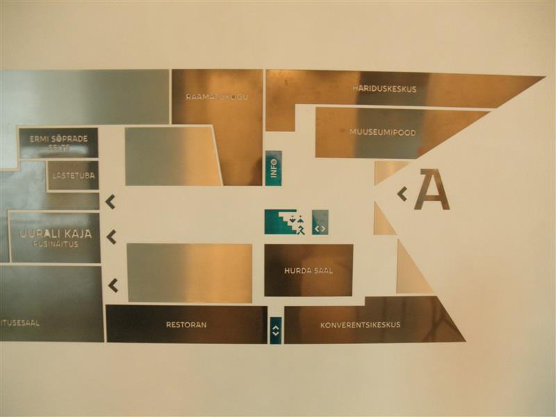 Lõpuks veel paar sõna uue muuseumi graafilisest identiteedist, eelkõige logost. Velveti büroo tehtud suur E-täht võtab külastajaid vastu monumentaalses fuajees. Agentuur ise on uue identiteedi saatetekstis kalambuuritsenud, et eestlane on romb. Või siis kaks rombi ülestikku, nagu märgi E-tähel näha. Mina küll ei usu, et eestlane on romb. Eestlane on pigem ruut – stabiilne, kinnine, väheliikuv, kahtlev. Eks see rombi mõte tuli muidugi PR-osakonnalt, kui identiteediprogramm oli vaja muuseumile maha müüa. Kuna ideeline baas on kahtlane, siis pole ka visuaal parem. Mitte et tal midagi viga oleks – kõva keskmine, aga kipub kuidagi arhitektuuri rafineeritusele alla jääma. Seda tajudes ongi suur E-täht fuajees koostatud high-tech-võrgust. Materjal päästab mõtte lapidaarsuse. Sealsamas fuajees on aga maja korruste plaanid väga selged ja elegantsed, kuigi ka seal mängib teostuse materjal oma õilistavat rolli.