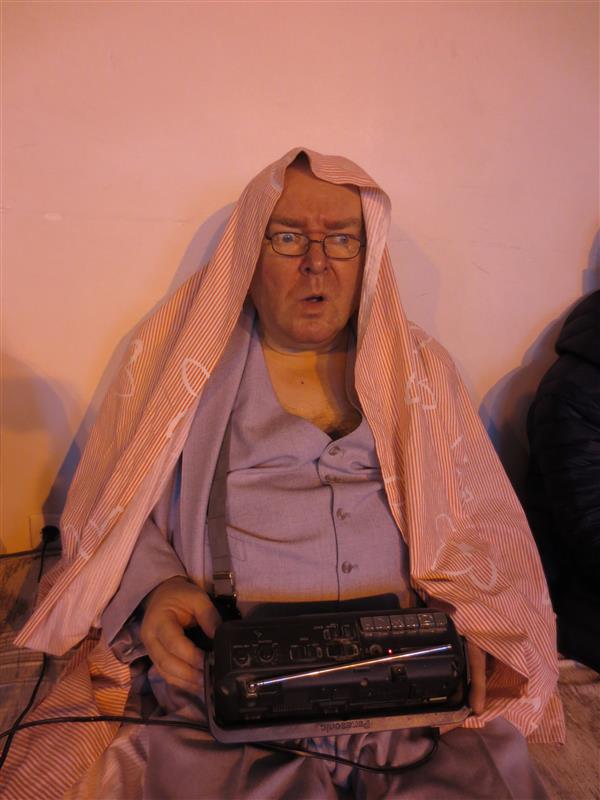 Selline lavalise ruumi lahendus asetab etenduse keskmesse Autori Teksti. Kirjapandud sõna ei eksita mitte miski, isegi mitte helikujundus, milleks on aeg-ajalt õhku paiskuv raadiomüra, inimliku kommunikatsioonivõimetuse tühjus. Mulle meenub üks Jaan Toominga lavastus, kus hull mees kuulas jumala häält raadiomüra seest. Näitlejad on Sõna kuuldavaletoomise instrumendid, nad annavad teksti tihedalt värvitud aegruumis kesk raadioeetri raginat (jumal?). Kõrvaga kuuldav on komponeeritud kaheselt: esmaselt kuuleme esinäitleja monoloogi, mis tegelikult peaks justkui olema dialoog, teiseselt sekundeerivad talle koorina kõrvalosatäitjad, kes ülejäänud teksti koolilapse kombel ilmekalt ette loevad ja kelle ilmekas ilmetus tühistab igasuguse dialoogi juba eos.