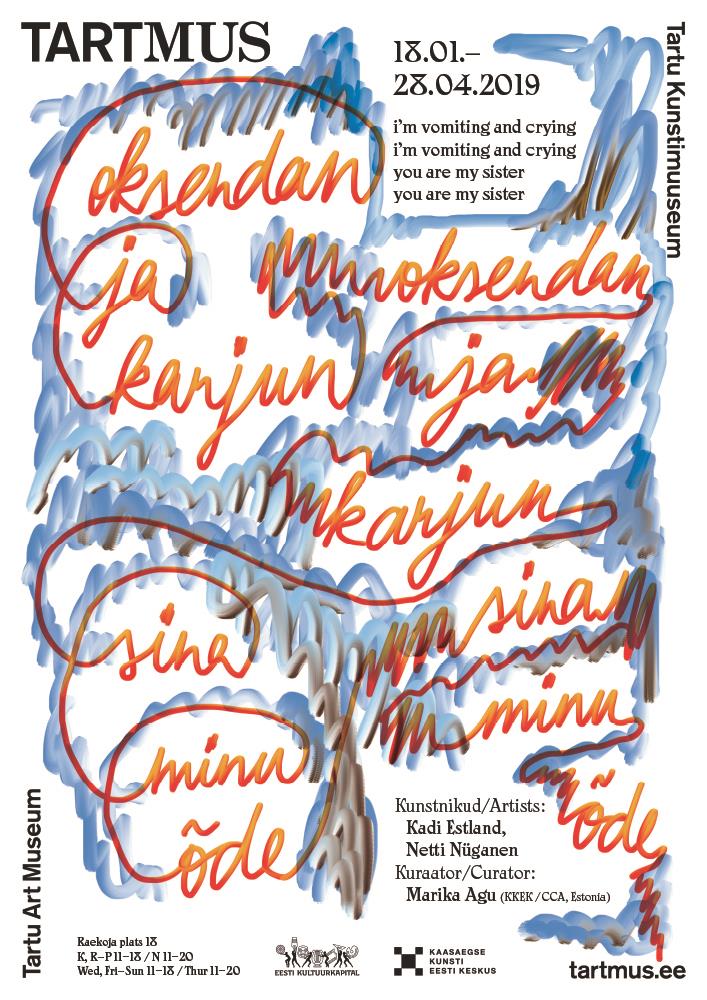 Näituseplakatite hulgas torkab oma ekspressiivsusega silma Brit Pavelsoni Kadi Estlandi ja Netti Nüganeni näituse „oksendan ja karjun, oksendan ja karjun, sina minu õde, sina minu õde“ plakat. See tuletab meelde omaaegset polikliiniku laboratooriumi, kus sõrmest välja pigistatud verd klaasitükile laiali hõõruti. Disaineri sõrmega soditud meeleheitlikud kirjad loovad peaaegu kehalise ja õõvastava aistingu.