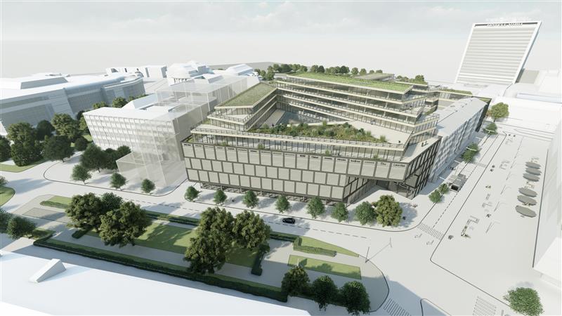 Allianss arhitektid rõhutasid tervikliku räästakõrgusega linnakvartali teket, kus pealmine büroode osa moodustab kvartali sisse taanduva haljastatud kõrgendiku.
