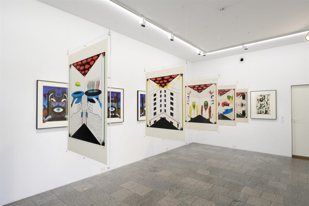 Mida siis näha saab? On varasemalt vähem näidatud, aga ka täiesti uusi graafilisi sarju. Näiteks söövitustehnikas triptühhon „Tehis- ja ehisliikurid“ (2025). Kunstnikule omases sümmeetrilises kujundisüsteemis lendlevad seeria keskmisel lehel (II) antropomorfsed ja külgnevatel (I ja III) drooni- või niiduroboti laadsed objektid. Mida need pildil teevad, ei tea – võib-olla on lihtsalt ilusad, võib-olla kuulavad Kraftwerki, ansamblit, mis sügisel taas Tallinna tuleb. Igal juhul on vaatajal siit võimalik soovi korral välja lugeda päevakajalisi kommentaare nii tehisaru temaatika kui ka geopoliitilise olukorra ja uute infotehnoloogiaga puhverdatud sõjapidamisviiside kohta.