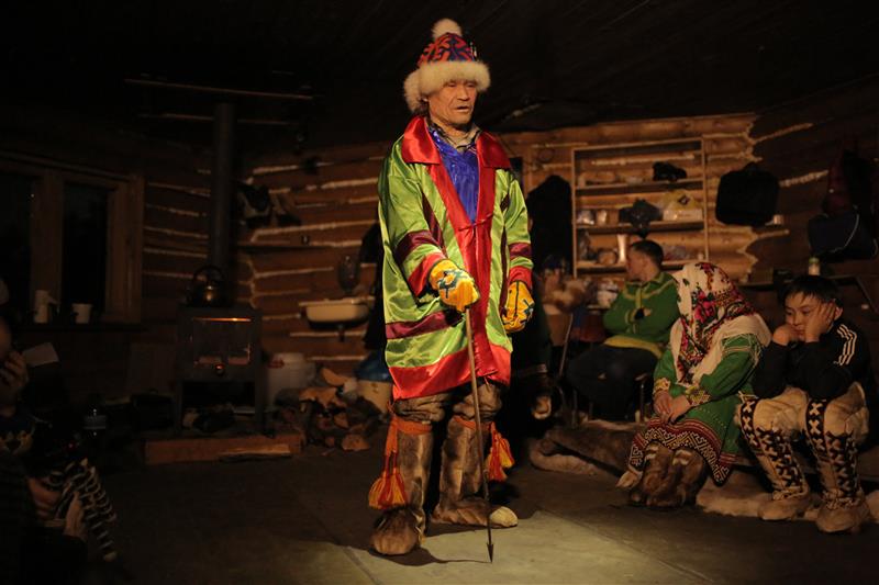 Sergei Ketšimov on šamaan ja tuntud rahvalaulik, kelle valdustesse jääb Imlori järv. Samas piirkonnas on suured naftamaardlad. Pildil karupeietel aastal 2016.
